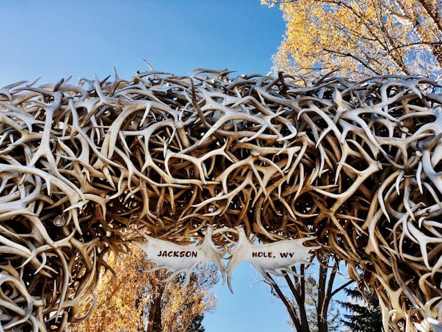 Begin your winter getaway in the Town of Jackson, where snow-dusted streets and wooden boardwalks set the tone for a classic Western welcome. Start with a stroll around Jackson Town Square, home to the iconic elk antler arches that frame the surrounding mountains beautifully in winter.