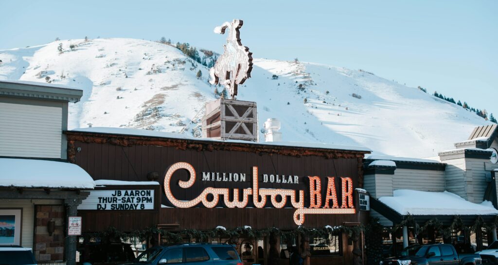 As evening approaches, head to the legendary Million Dollar Cowboy Bar. Famous for its saddle bar stools, neon cowboy sign, and live country music, it remains one of Jackson Hole’s most iconic venues. Whether you stop in for cocktails or dinner, it’s an essential winter experience. Nearby dining options include The Blue Lion for refined American cuisine and Local Restaurant & Bar for a relaxed, historic atmosphere.