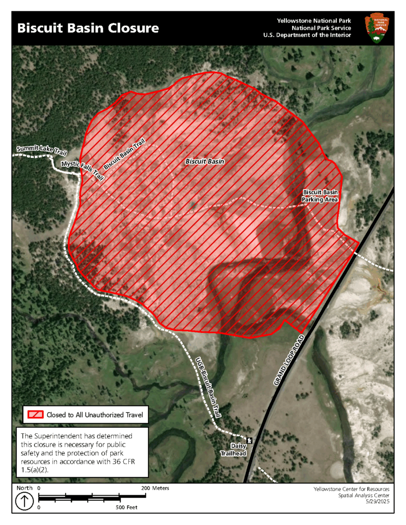 Biscuit Basin Closed Due to Hydrothermal Explosion Alert 1, Severity closure, Biscuit Basin Closed Due to Hydrothermal ExplosionThe parking lot, boardwalk, and Firehole River at Biscuit Basin, located north of Old Faithful, is closed to all travel until further notice due to the possibility of another event at the site of a hydrothermal explosion that occurred July 23, 2024