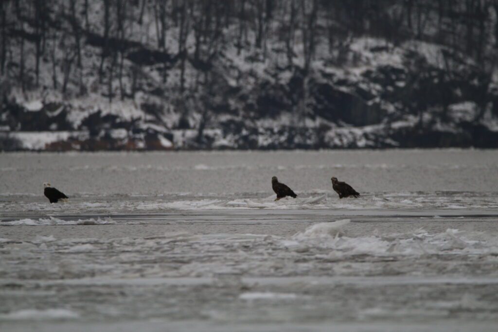 The Lower Hudson River Valley, which stretches from the northern suburbs of New York City to the southern parts of the Catskills, is a prime location for wintering bald eagles. The river provides an abundant food source for the eagles, primarily consisting of fish, particularly herring and striped bass, which thrive in the brackish waters. The region’s steep cliffs, wooded areas, and open spaces also offer eagles safe perches and nesting sites. The moderate winter temperatures compared to more northern areas make it an ideal stop for eagles on their southward migration, as they sit on ice flows and fly above the over areas in search of prey.